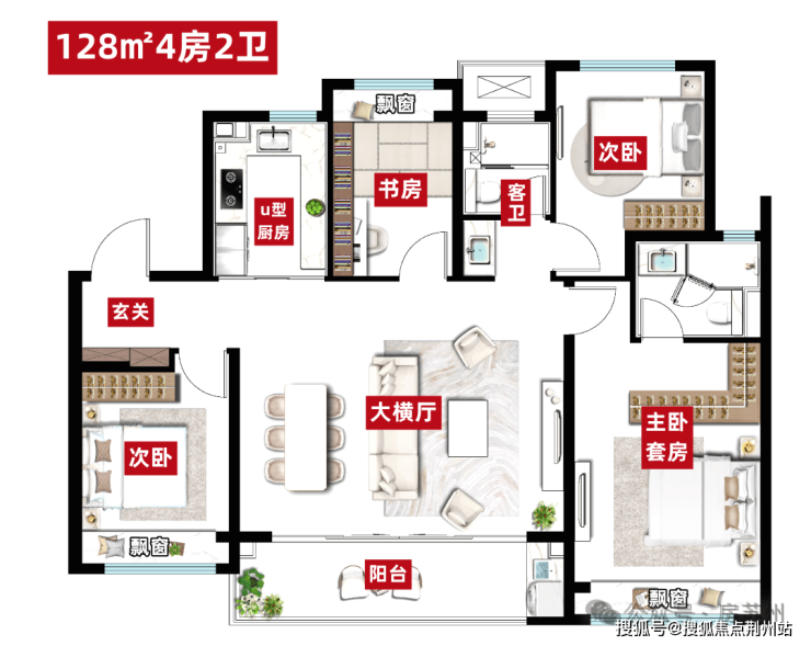 户型配置也非常纯粹,建面约128/143㎡2个户型,全是大4房,高得房率。