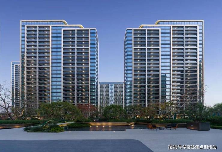 塔冠跌退造型和弧形转角玻璃,润府建筑汲取永嘉山水灵感、勾勒“山水画屏”美学立面。大面积蓝灰色玻璃覆盖,再搭配银灰色、香槟金和深灰色铝板、金属框线,打造类公建化建筑,凸显立面层次和立面质感。