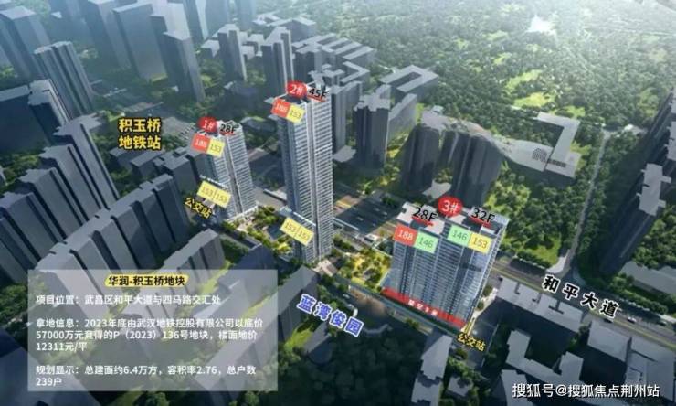 华润望雲位于武昌区和平大道与四马路交汇处,地处武昌内环积玉桥板块核心位置,项目由武汉地铁集团与华润置地合作开发,华润占股51%并主导操盘,总建筑面积约6.4万方,容积率2.76,规划3栋住宅共239户,户均面积约156㎡,定位为纯改善社区。