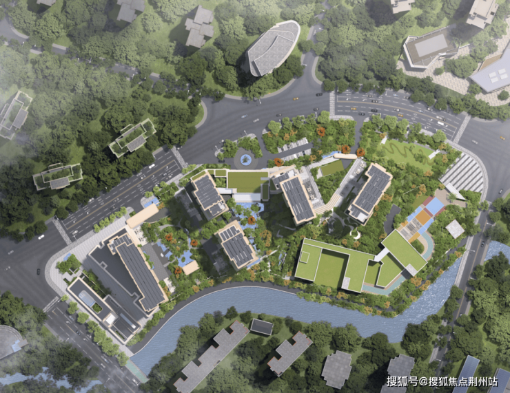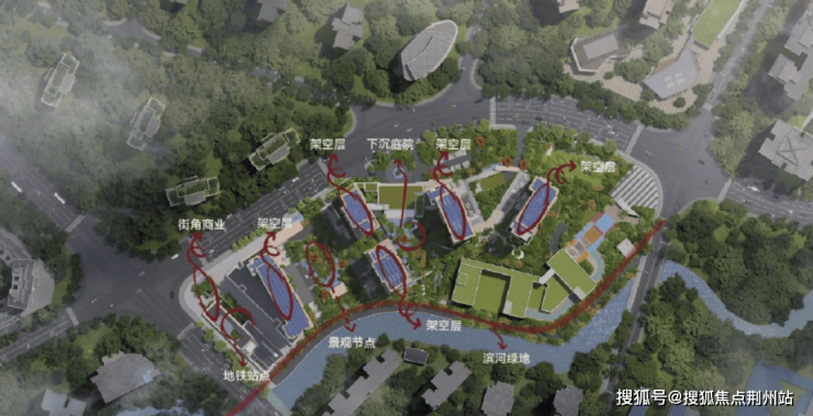 步入社区的第一重仪式感,始于社区整体抬升约1.3-1.4米的“玉盘托珠” 格局。设计师以精妙的地形重塑,将河道景观化为私家长廊,形成天然的视觉屏障与观景台。