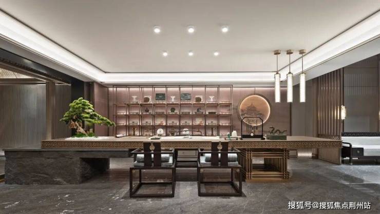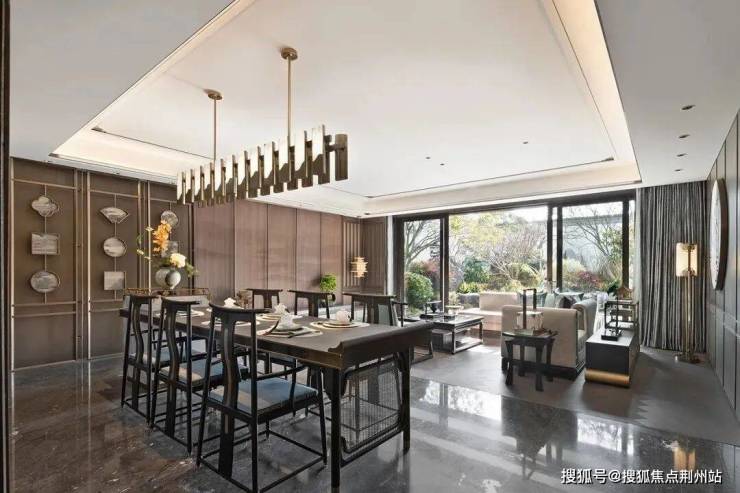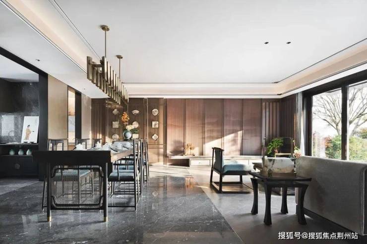 餐厅与客厅分而不割,互相渗透,在自由的空间中形成家庭社交空间。无隔断设计使空间关系更紧密,生活场景丰富多彩,带给一家人舒适优雅的用餐环境与社交体验。陈设以“陶都文化”融汇美好器物延展营构空间,呈现风雅东方诗意生活。