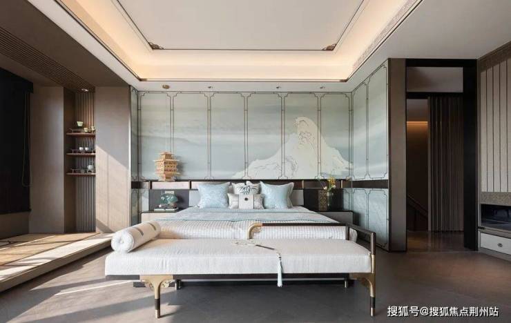在空间本质美的构建上,主卧延续整体设计基调,墙面定制的山水背景铺陈出静谧的美感。室内置入茗茶区,对于居者的审美与喜好而言,空间的整体视觉风格和功能体验都是优雅的体现。阔景宽窗引景入室,以光涤尘,和谐共生。一杯茶、一本书,让仪式感与观赏性都一览无余。