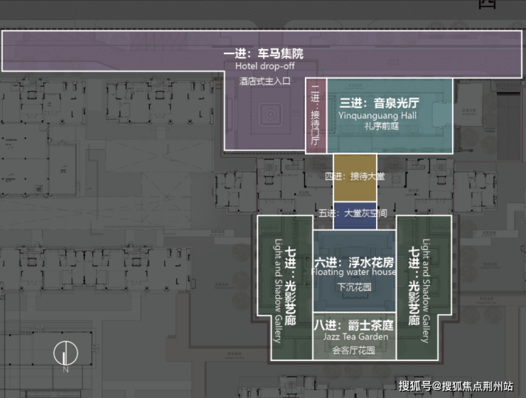 一进车马集院;二进接待门厅;三进音泉光厅;四进接待大堂;五进大堂灰空间;六进浮水花园;七进光影艺廊;八进爵士茶庭。