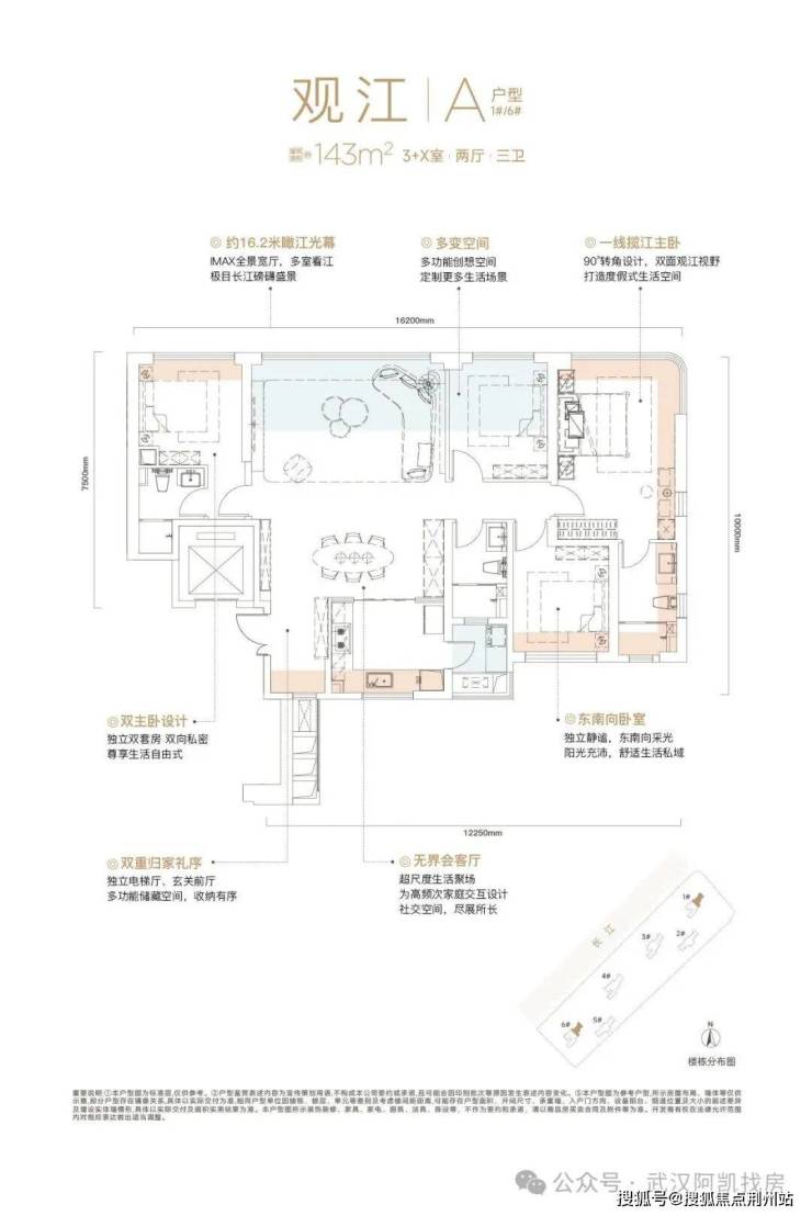 ✅ 布局特点:餐客厅一体,看江面无承重柱;主卧套房环幕落地窗瞰江,7.6 米 IMAX 环幕厅,对标华润长江中心 230㎡格局。