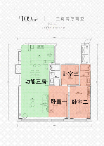 亮点三:该户型可以大横厅+两房/功能三房之间自由切换,后期装修更灵活!
