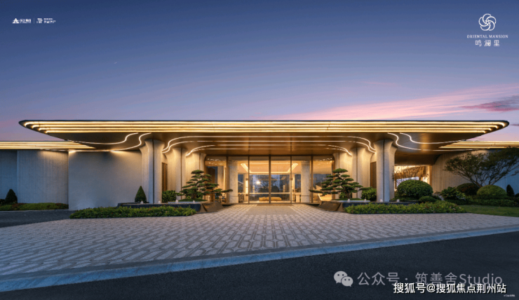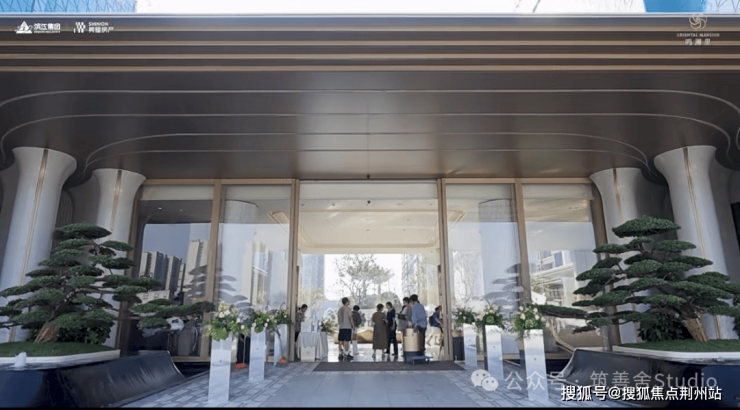 小区主入口采用现代化酒店式门楼设计,跨度达66米,融合金属与玻璃材质,彰显都市美学。两侧石材景墙如屏风般展开,对称种植名贵罗汉松,整体气势恢宏,归家仪式感十足。