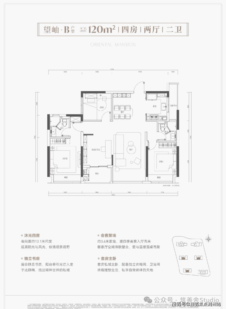 建面约120平米户型,四居室户型,同面积段罕见的约13.1米南向超大面宽,四间卧室面宽均超3米,南向主卧与次卧分列客厅两侧,私密性极佳;客餐厅与阳台无缝衔接,空间开阔大气,采光更佳;主卧采用套房设计,舒适度全面升级。