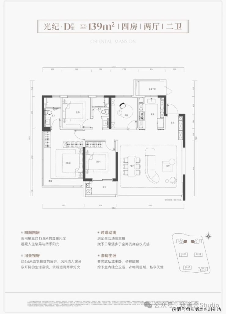 约139平米的户型分为横竖两款,均为边套设计,两梯两户,尊崇感与私密性并存。“横版”户型拥有四开间朝南、大方厅、L型转角飘窗的“全景舱主卧”以及超级双联阳台。