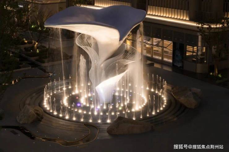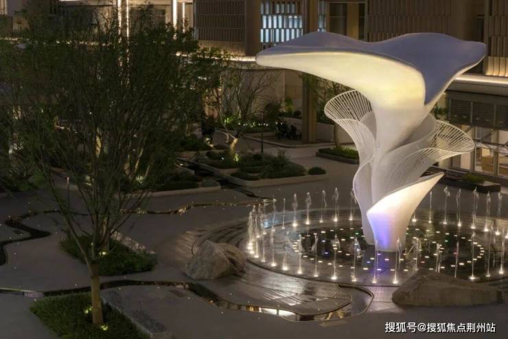 艺术装置“理想之花”提炼合欢意象,形态自底部含苞渐次向上盛放,既是对历史记忆的凝练,亦隐喻着汉口百年发展的蓬勃轨迹,成为极具视觉冲击力的精神地标,结合声、光、雾的互动喷泉,聚集人气,形成强烈的场域昭示。