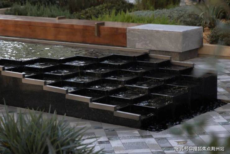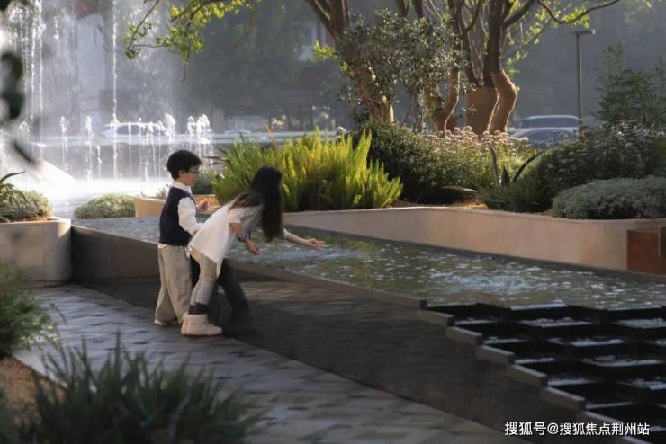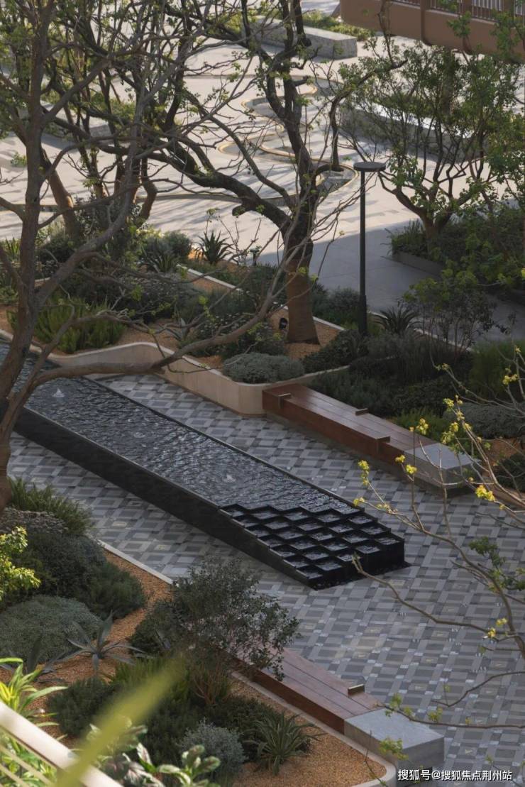 110m的带状水景以蓝钻花岗岩为底,水景边缘利用微小高差营造叠水轻声,动静相宜。漫步于此,潺潺水声与植物芬芳交织,让疲惫悄然消弭。