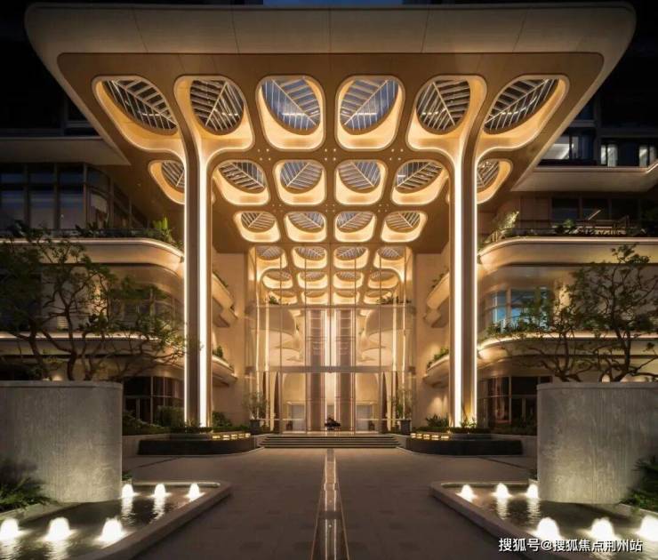 主入口以艺术化的门庭景观,构筑了项目与城市对话的界面——奢石景墙、精致水台与海派拱券,三重对景叠合出主入口的礼仪感和精致度,面向城市呈现了一处微型艺术展场。