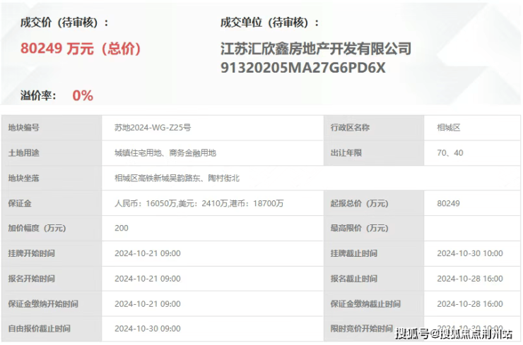 地块信息:苏地2024-WG-Z25号地块,位于相城区高铁新城吴韵路东、陶村街北,占地约2.94万㎡,容积率2.4,楼面价约11,369元/㎡。