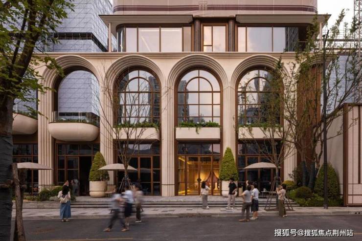 古铜色金属线条化作现代幕墙的横向分割线,270度曲面玻璃的转角,又延展出仿石铝板罗马柱,让古典美学在当代复兴。