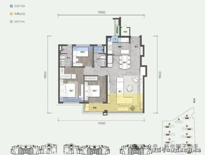 就拿最小面积(规划计容面积)约100平三房户型来说: