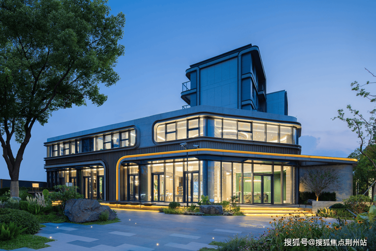 最终,该金属光带系统与商业配套建筑的立面设计形成精准对位——通过材质延续、色彩呼应及线性逻辑的深度关联,实现从入口飘板到围墙界面,再至商业建筑的完整视觉闭环。