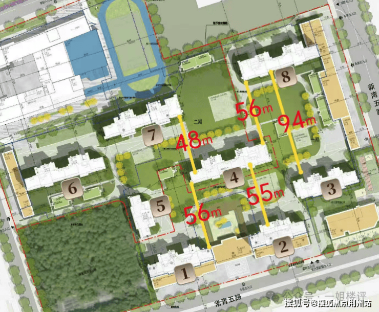 楼间距开阔:部分楼栋间距超50米,3号楼与8号楼间距达94米,采光和视野优越。