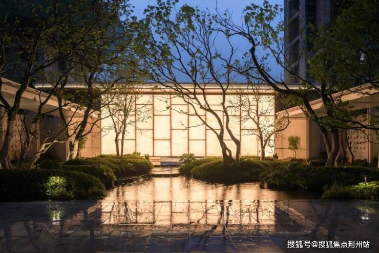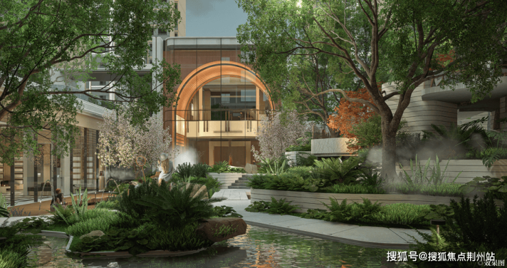 呈现在眼前的面积600㎡光影静谧庭院!高约3.8米,长约22米的对称式风雨连廊,融入书卷造型,曲线感十足!透过花格砖景墙漏景,约160㎡镜面水景,层层叠水结合乌桕,让每一次回家都是沁人心脾的松弛感!