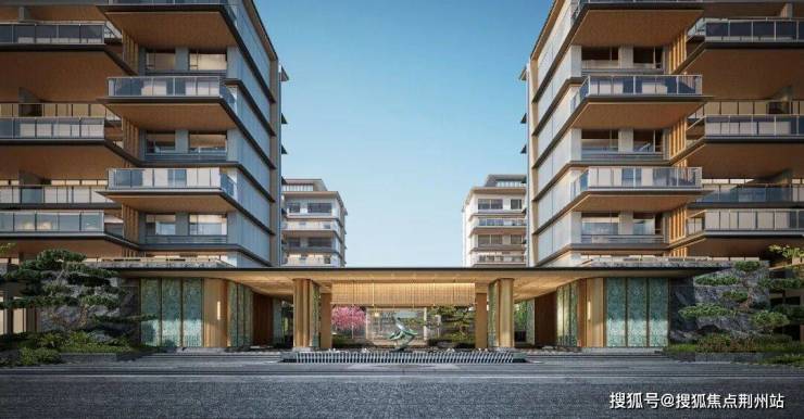 主入口采用酒店落客式手法,汲取衢州书院文化气质,打造院落式归家大堂,一进景观院落面向城市空间打开,犹如一幅展开的山水长卷,端庄大气。材料上通过石材和铝板及格栅的运用,搭配景观绿植,在近人尺度上体现精致典雅的东方气质。