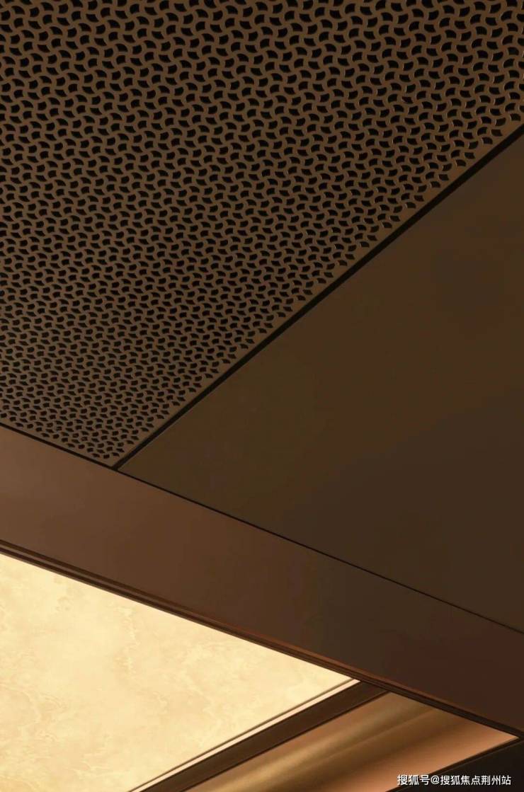 再来看到地库的吊顶,仿铜铝板以兰花镂空图案打造,次车道辅以格栅设计,车行其间光影斑驳。