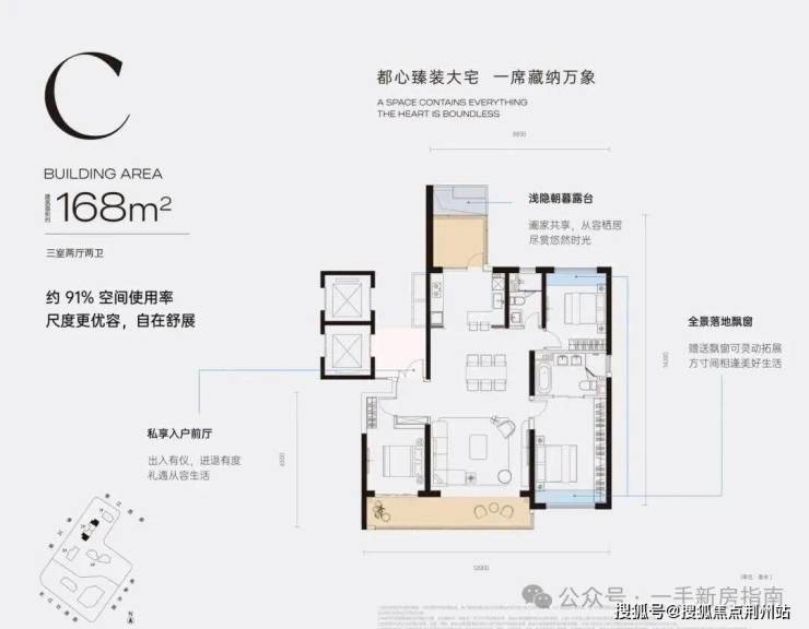 C户型168㎡三房:全明格局,客厅朝南,卧室朝南,明厨明卫,大面宽阳台。