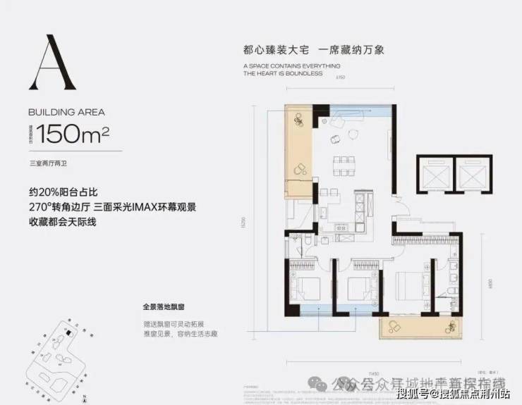 A户型150㎡三房:入户独立玄关,动静分区;北侧休闲活动区,厨房-餐厅-客厅相连对接景观大阳台。