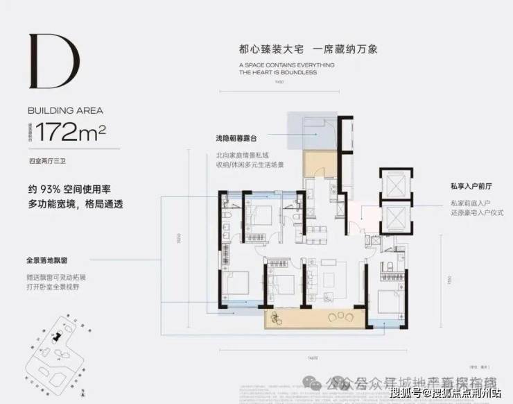 D户型172㎡四房:四开间朝南,三卫设计;主次卧带飘窗;南侧阳台直通客厅和次卧。