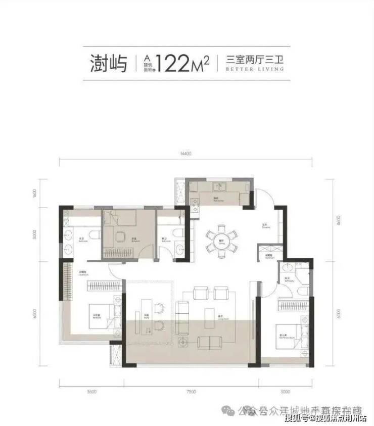 该户型为西边端头户型,南北通透,3+1房设计,4开间朝南,拥有约14.4米南向面宽,约7.8米大横厅,也是极少数在120㎡+这个面积段就做到三个卫生间的户型。