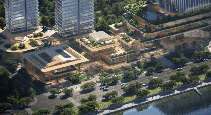 项目创新性地提出了“折叠社交”模式,通过“底盘双环”(精密商业环与家庭照料环)与“垂直三境”(低空花园露台、空中会所、云端会所)立体交织,将社交、生活与服务功能精密嵌入建筑的不同标高。