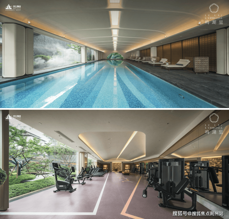 还有一座被命名为「湖山间」的下沉式CLUB,营造丰富的功能空间:恒温泳池、健身房、瑜伽室,还有壁球室、茶室、童玩区……这般媲美星级酒店的配置,是鸣湖里关于高阶圈层的生活方式表达。