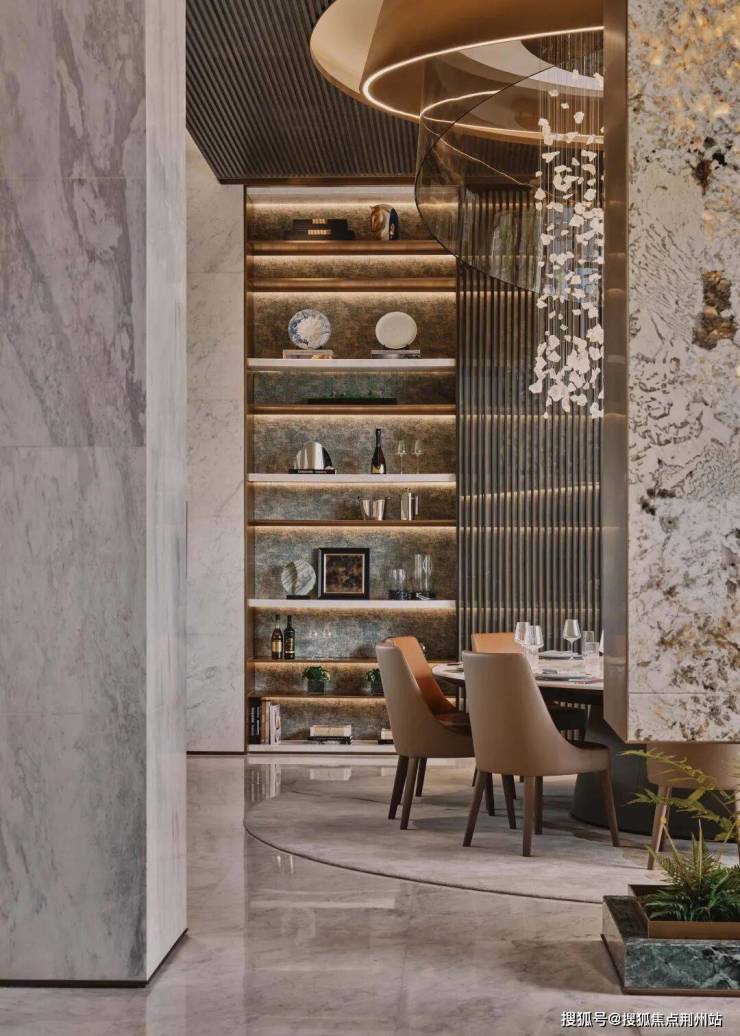 从户外跨入室内,足音轻落,光的絮语与影的徘徊,在此处交织成一片静谧的河流,大堂的景致展现在眼前。白金沙石台面泛着柔和纹理,而深棕背景墙则化身“江河鎏金”。以生动的波纹笔触,勾勒出婺江的凝练缩影,悄然奠定整体空间的意境基石。