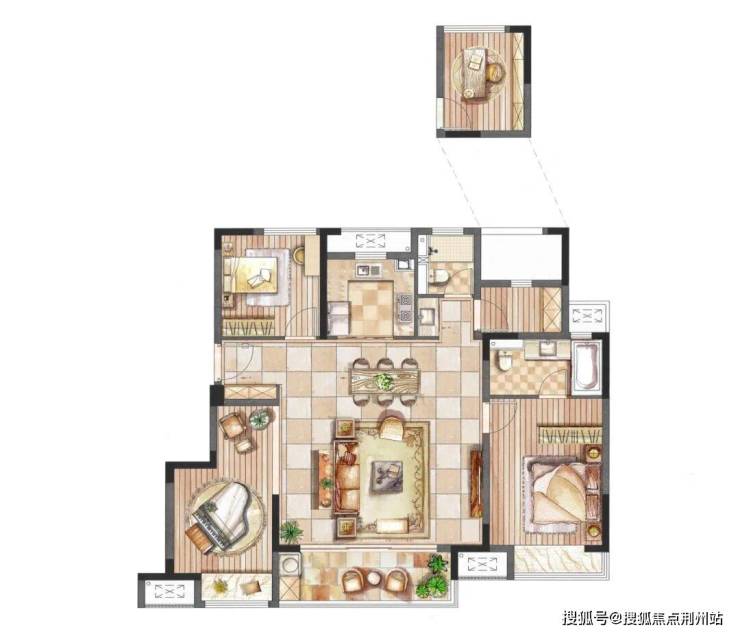 建面约120㎡洋房采用四叶草布局,三开间两卧朝南带大方厅,在有限面积内做到4房2卫,空间利用率高,采光和通透性出色。
