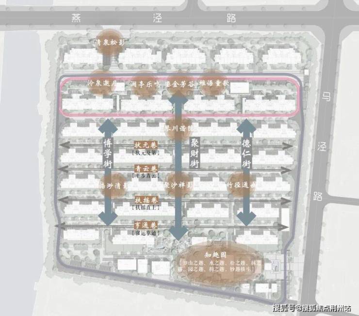燕语江南以「三街四巷」为脉络,辅以「十大景观节点」,串联起了社区各个部分。