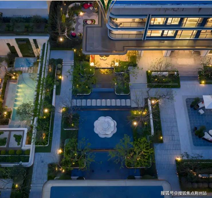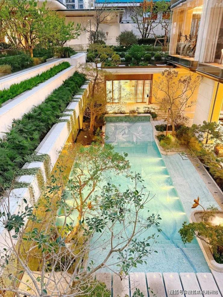 下沉式庭院巧妙借鉴自然山谷的形态,以叠水、绿阶、浮岛等元素精心构筑,呈现“飞瀑挂崖”的生动景致。庭院中央的女王画舫若隐若现于林水之间,业主可在此品茗赏景,尽享“都市女王”般的优雅与从容。