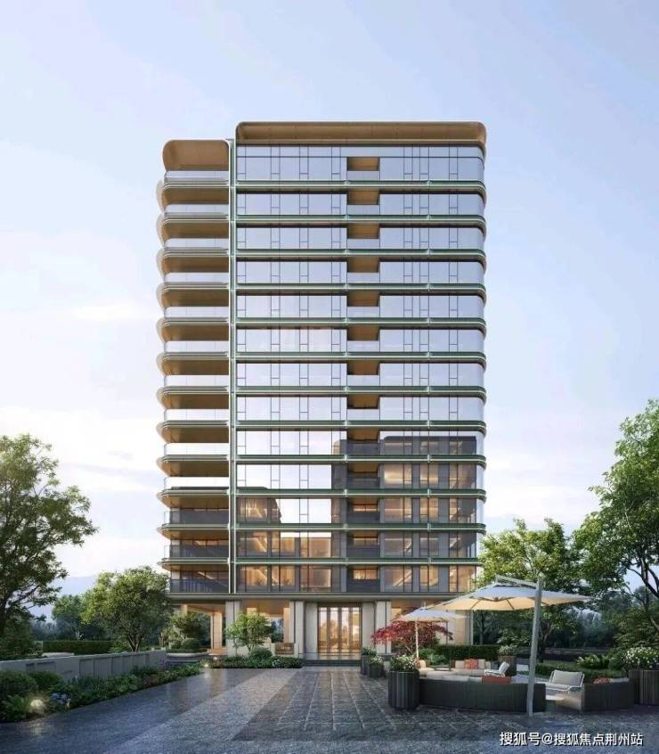 外立面设计采用绿色陶板层间拼接,并融入仿竹节造型的纵向陶瓷立柱,寓意事业蒸蒸日上。香槟金金属线条与掐丝镶翠工艺相结合,彰显精致细节。悬浮式檐口设计为整体立面增添立体层次与视觉张力。
