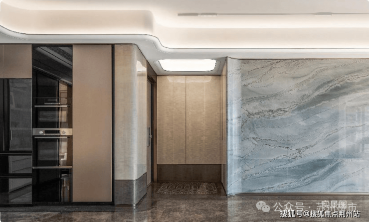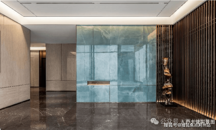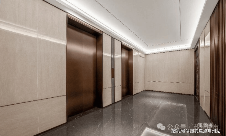 这份奢华氛围还延续至首层电梯厅(仅约180㎡首层电梯厅),整体以沉稳古铜色为主,电梯厅门采用蚀刻工艺高定纹案细节,厅内臻选青玉色调奢石,带来视觉与身心的双重奢享。