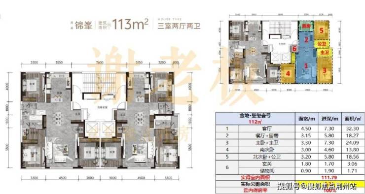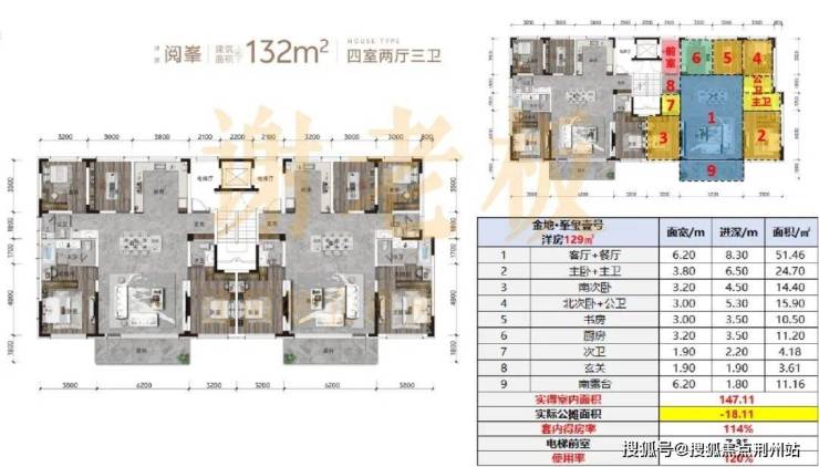 这款洋房户型得房率高达110%,实得室内面积约131.62㎡,还配有南露台和电梯前室,使用率提升至115%。