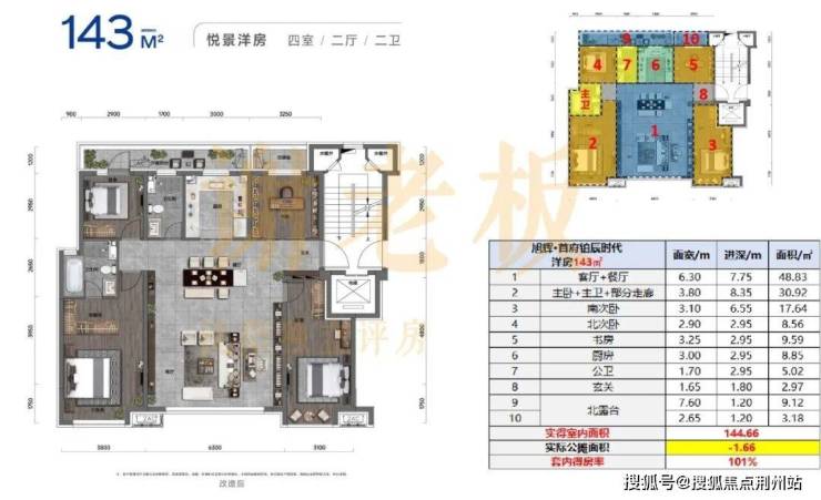 可选126平和143平两种洋房户型,都是四室两厅两卫设计,清水交付。126平总价150-165万,143平总价170-190万,得房率表现亮眼。