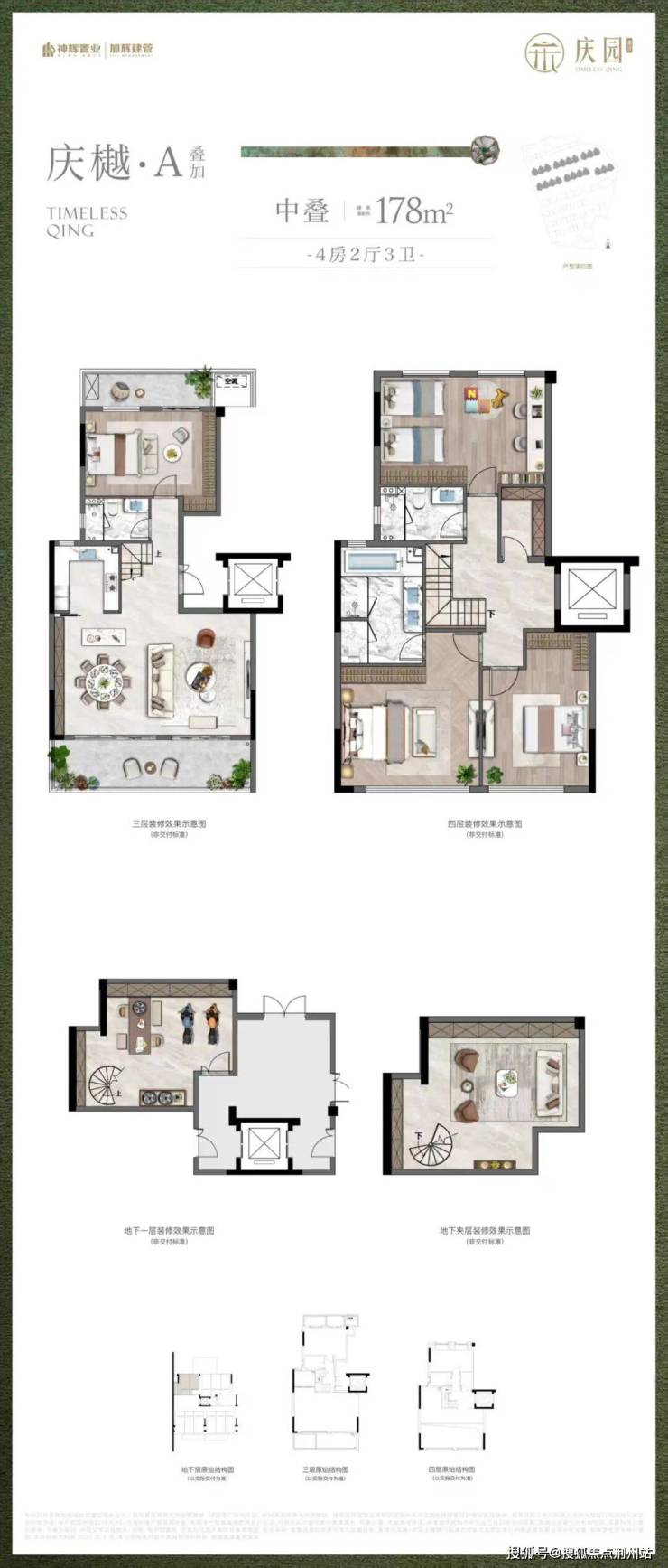 叠加(中叠)建面约178㎡,4房2厅3卫: