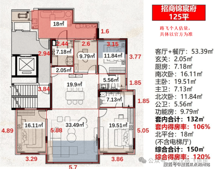 ①125m²户型:四房,得房率高达120%,采用独梯入户设计,南向面宽达12.85米,三开间朝南。户型赠送面积充足,北侧近18㎡平台为不计容面积,厨房与北向多功能间基本全赠送;南向次卧同样不计容,客厅与北向次卧也有半面积阳台优化,整体得房优势明显。