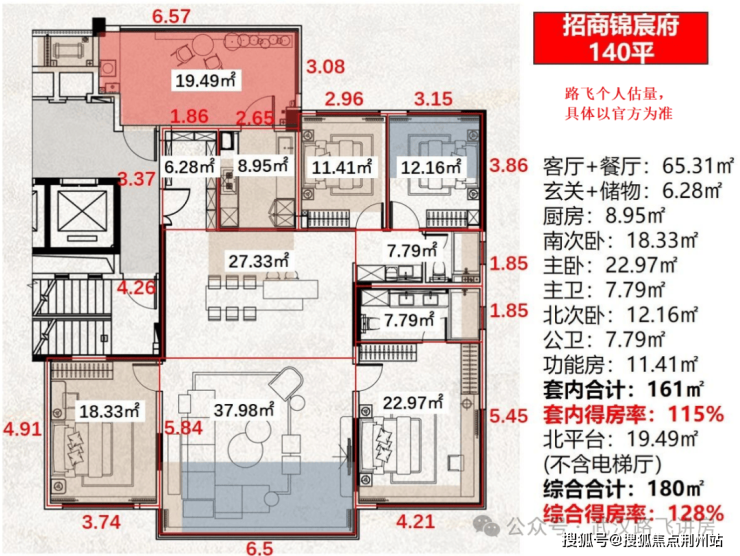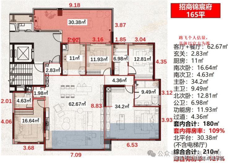 ③165m²户型:四房,得房率127%,采用独梯入户。仅北侧平台就有约30㎡,厨房、北次卧与南向次卧套房均为不计容面积,客厅和主卧还有大量半计容空间,整体优化面积十分可观。
