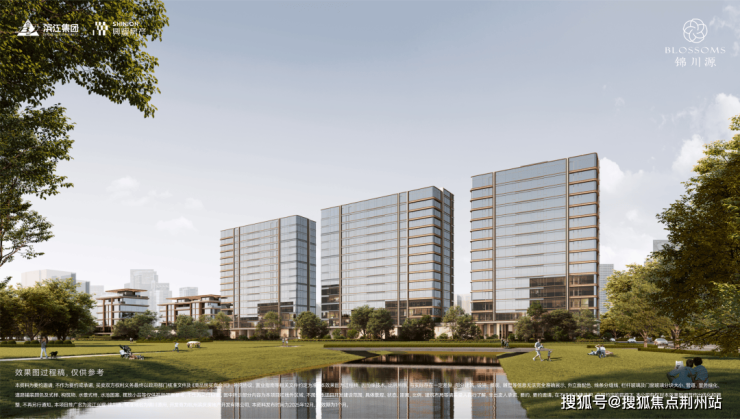 锦川源采用现代公建化极简风格,以 “玻璃方舟” 为设计理念,整体采用金色铝板、大面玻璃幕墙与贝金米黄石材组合,线条干净利落,质感高级。建筑转角采用圆弧处理,弱化硬朗边界,让光影在立面自然流动;阳台统一封包,无外露管线,整体通透简洁。白天倒映天光水色,夜晚透出温润灯光,成为滨江区一道轻盈而高级的城市天际线。