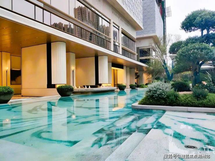 项目以高奢酒店为灵感,打造总长约 95 米、挑高约 6.4 米的恢弘门庭,石材立面大气舒展,搭配艺术水景与环岛礼序,形成极具辨识度的入口形象。贝金米黄奢石与梵高白奢石相互映衬,简洁线条勾勒出现代质感,从落客、穿行到入园,层层递进的空间过渡,让每一次归家都像入住一座城市度假酒店,繁华与静谧在此自然切换。