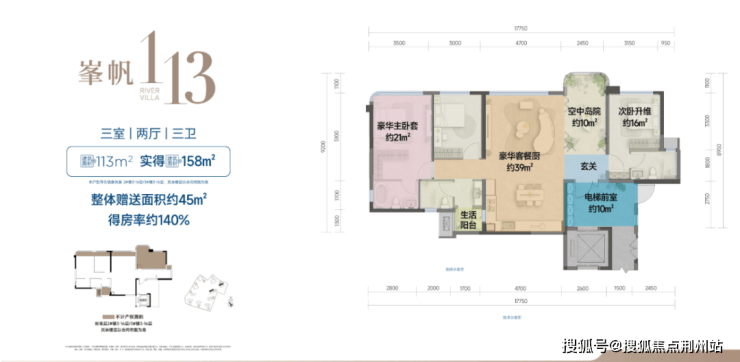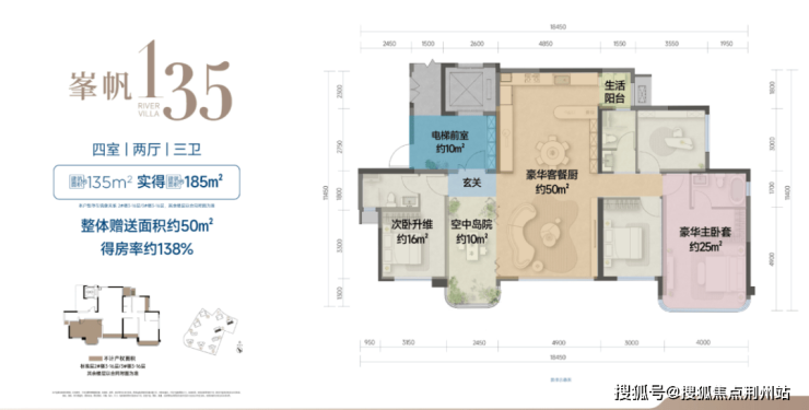 峯帆系列户型更加注重功能空间设计,建面约113㎡的户型,赠送面积约45㎡,实际得房率约140%,做到了三房三卫。建面约135㎡的产品,赠送面积约50㎡,实际得房率约138%,做到了四房三卫。