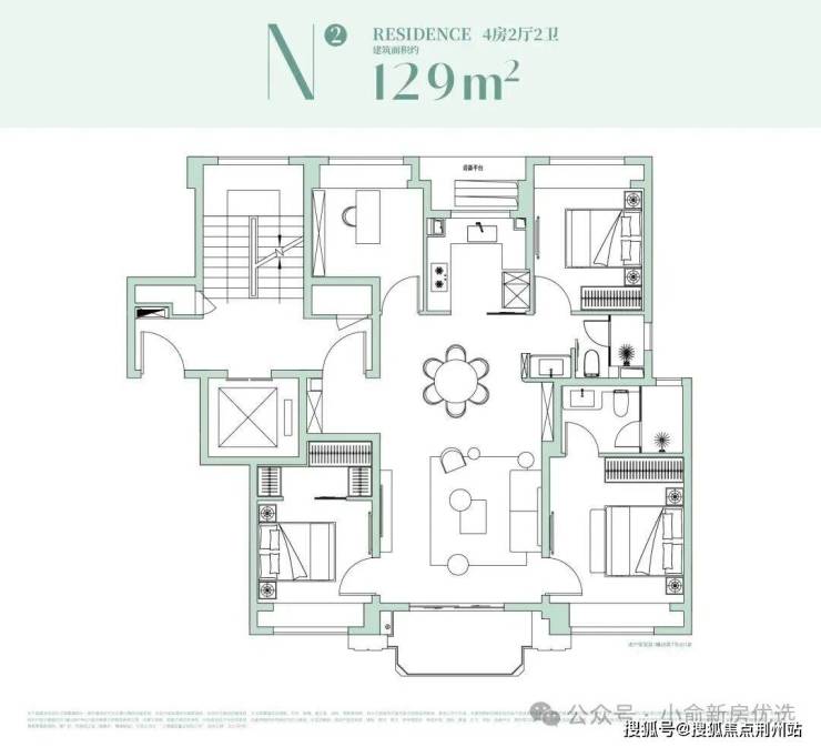 129㎡基本是这次产品线里的“人气担当”。四叶草格局让四个房间分布在四角,私密性和动线都有保证;南向三开间+宽尺度客餐厅,让一家人的起居、社交都很舒展。