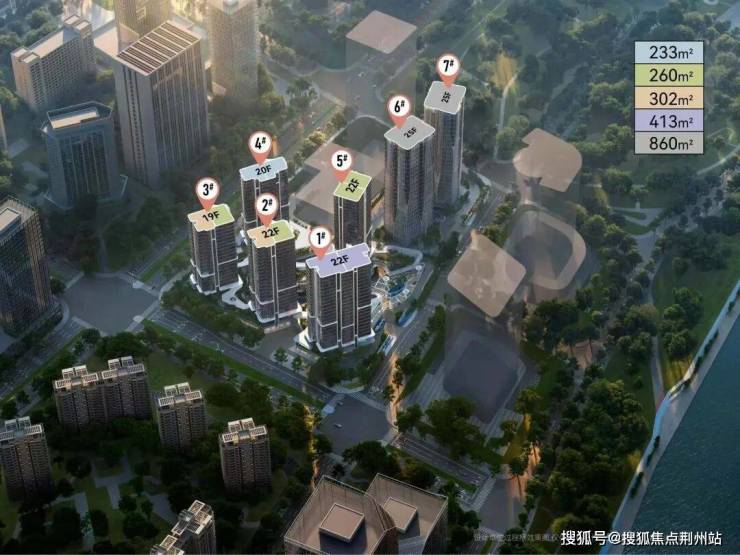 项目由5幢19-22层高层住宅和2幢25层商业大平层组成,整盘容积率为3.3(含商业部分),住宅户型面积约233-413㎡,商业大平层户型面积约860㎡,总计200户。