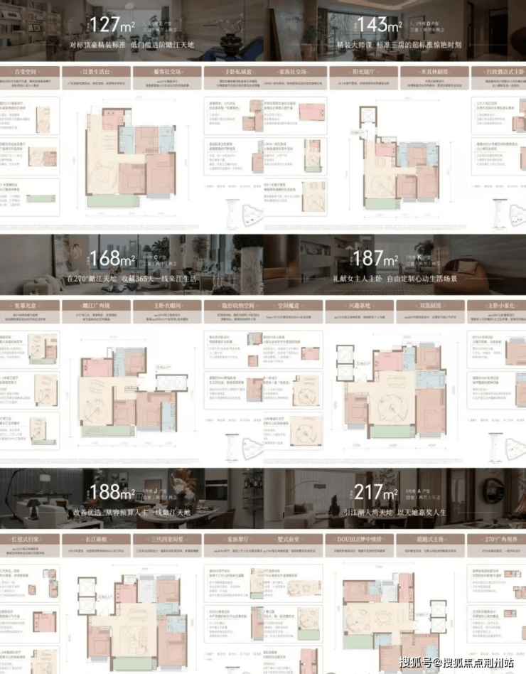 户型多样:主推建面约127-217㎡精装房源,包括三房、四房户型,部分高楼层可享270°观江视野。