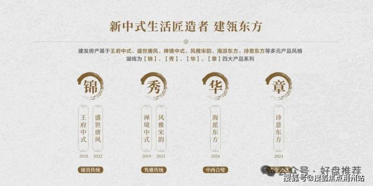 建识东方,发献大美,建发房产基于王府中式、盛世唐风、禅境中式、风雅宋韵、海派东方、诗意东方等多元产品风格,凝练为【锦】、【秀】、【华】、【章】四大产品系列。