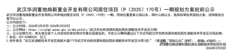 3月20日,武汉华润置地焕新置业开发有限公司居住项目(P(2025)170号)一期规划方案批前公示,该项目即光谷润璟,华润在关山的全新楼盘。