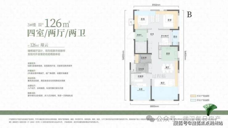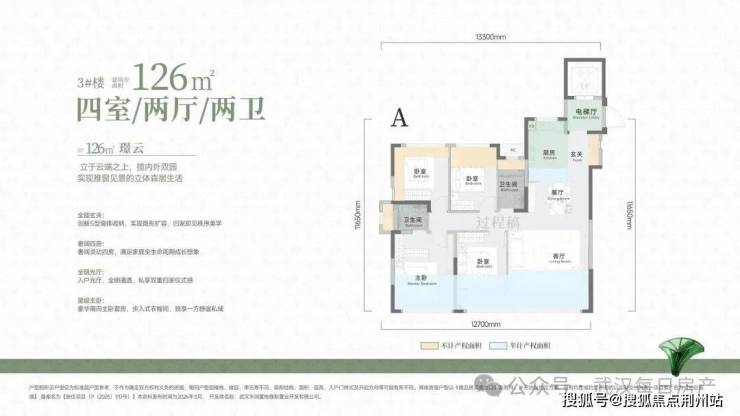 独立电梯入户,270度客厅视野,进门的多功能区外面带有晾晒阳台,北侧卧室双面优化,不足之处就是进深较长。