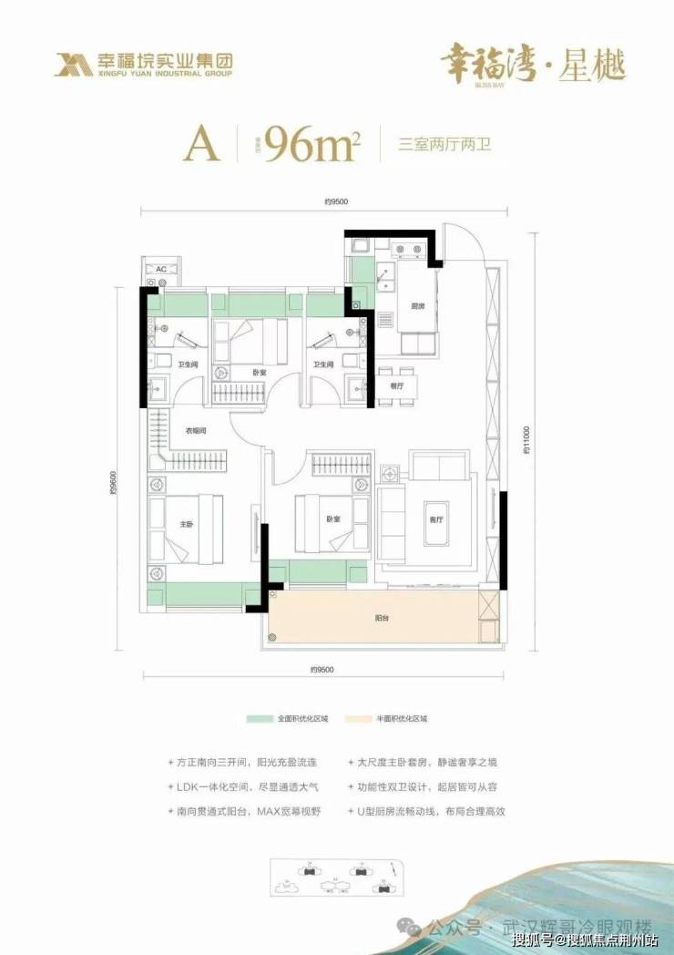 5、U型厨房流畅动线;6、南向贯通式阳台;7、方正南向三开间;8、大尺度主卧套房;9、功能性双卫设计。